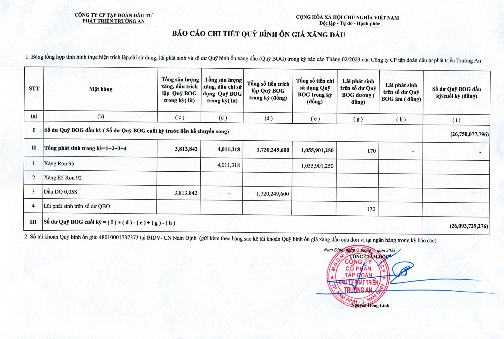 Công Ty CP tập đoàn đầu tư phát triển Trường An xin chịu trách nhiệm toàn diện trước pháp luật về tính chính xác của quỹ bình ổn xăng dầu mà chúng tôi đã báo cáo.