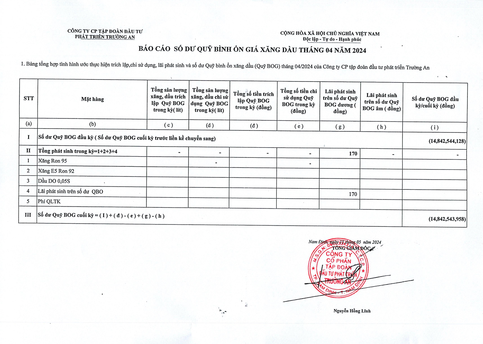 Báo cáo số dư Quỹ bình ổn giá xăng dầu tháng 4 năm 2024.