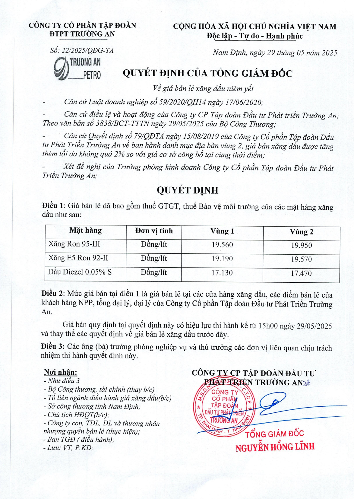 Nam định ngày 29/05/2025 Công ty Cổ phần tập đoàn đầu tư phát triển Trường An chính thức điều chỉnh giá xăng dầu theo quyết định số 22/2025/QĐG-TA ngày 29/05/2025 của Tổng Giám Đốc, theo đó mức giá bán đã bao gồm thuế giá trị gia tăng các mặt hàng xăng dầu như sau: