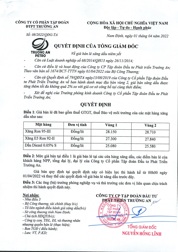 Nam định ngày 01.04.2022, Công ty Cổ phần tập đoàn đầu tư phát triển Trường An chính thức điều chỉnh giá xăng dầu theo quyết định số 08/2022/QĐG-TA ngày 01.04.2022 của Tổng Giám Đốc, theo đó mức giá bán đã bao gồm thuế giá trị gia tăng các mặt hàng xăng dầu như sau: