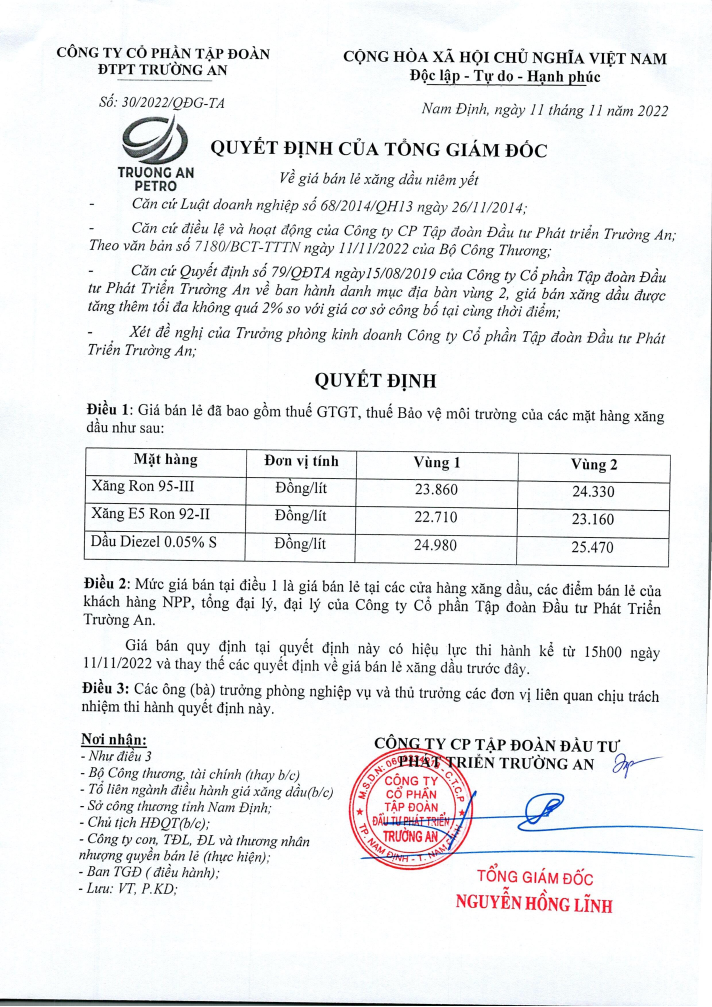 Nam định ngày 11.11.2022, Công ty Cổ phần tập đoàn đầu tư phát triển Trường An chính thức điều chỉnh giá xăng dầu theo quyết định số 30/2022/QĐG-TA ngày 11.11.2022 của Tổng Giám Đốc, theo đó mức giá bán đã bao gồm thuế giá trị gia tăng các mặt hàng xăng dầu như sau: