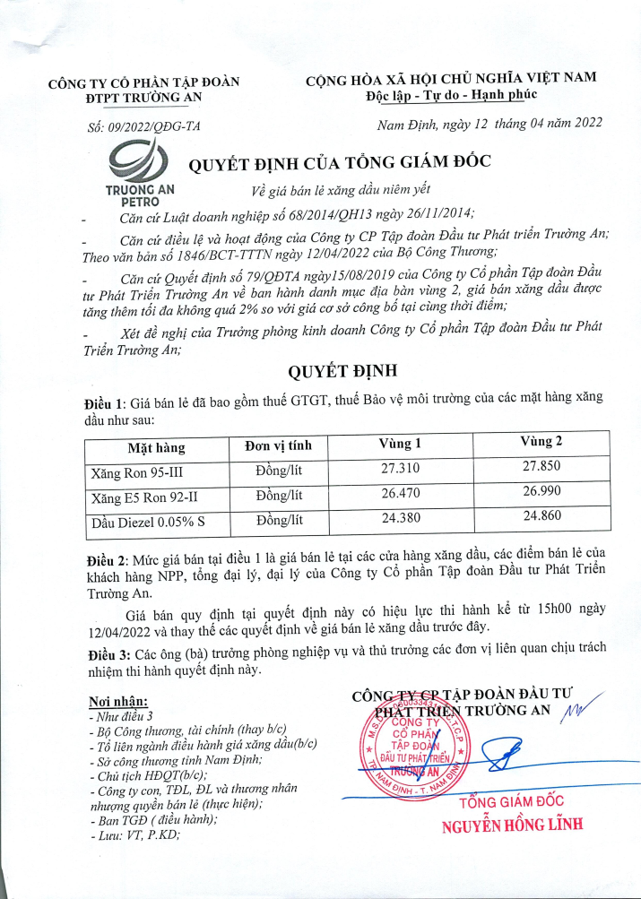 Nam định ngày 12.04.2022, Công ty Cổ phần tập đoàn đầu tư phát triển Trường An chính thức điều chỉnh giá xăng dầu theo quyết định số 09/2022/QĐG-TA ngày 12.04.2022 của Tổng Giám Đốc, theo đó mức giá bán đã bao gồm thuế giá trị gia tăng các mặt hàng xăng dầu như sau: