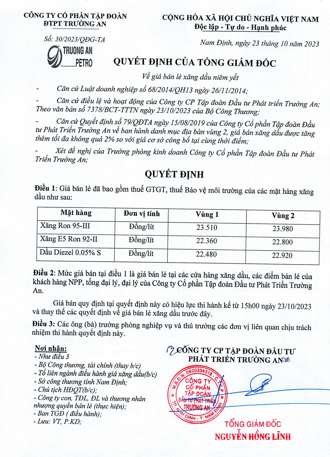 Nam định ngày 23.10.2023 , Công ty Cổ phần tập đoàn đầu tư phát triển Trường An chính thức điều chỉnh giá xăng dầu theo quyết định số 30/2023/QĐG-TA ngày 23.10.2023 của Tổng Giám Đốc, theo đó mức giá bán đã bao gồm thuế giá trị gia tăng các mặt hàng xăng dầu như sau:
